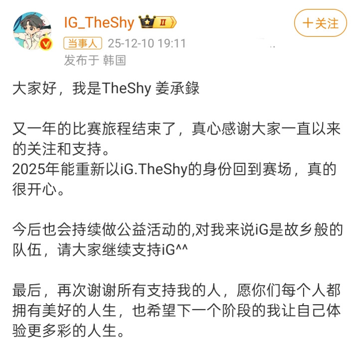 值得一提的是,在IG俱乐部官宣TheShy离队休赛的消息后,TheShy随即便在个人社交账号发文告别赛场,坦言在S15赛季,能够以IG上单选手的身份重新回到赛场,感到十分开心,希望下一个阶段的自己可以体验更多精彩的人生。对此,LPL大满贯教练朱开认为,TheShy大概率要永久退役了,TheShy已经明确表示,未来将开启下一阶段的精彩人生,其实就是准备告别职业赛场了,尽管LPL观众粉丝们都希望TheShy未来能够再次复出,但可能性微乎其微。